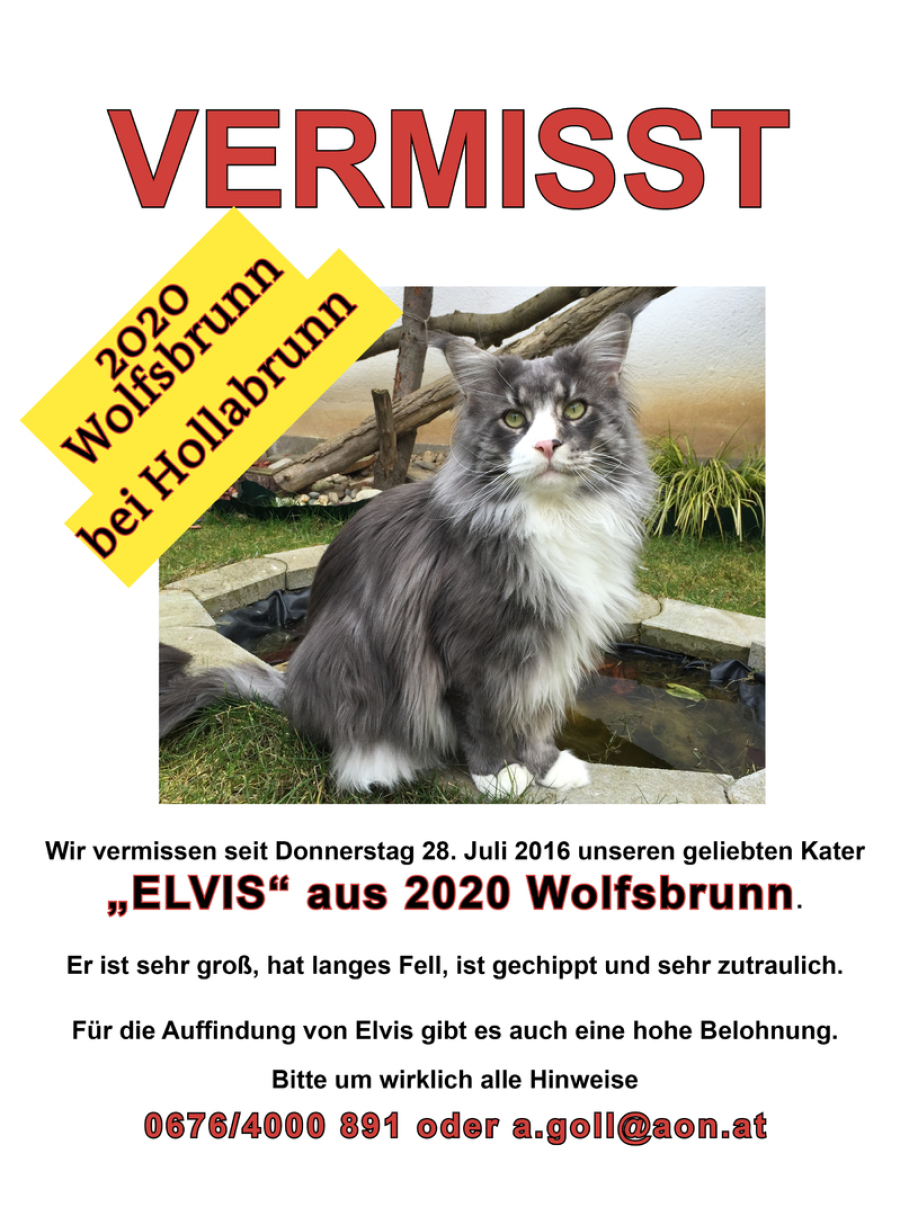 In der Nacht auf Do. 28. Juli 2016 sprang Elvis aus dem Fenster und ist seitdem spurlos verschwunden. Bisher hab ich keinerlei Anhaltspunkte wo er sich aufhalten könnte.